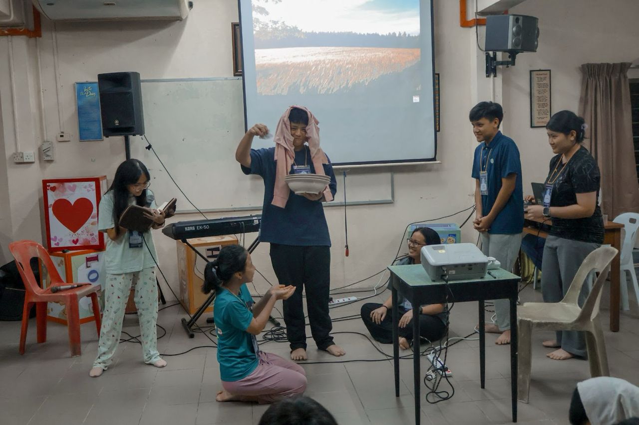 On the first day of the camp, the participants gathered at St. Lukas Centre, Kota Padawan, at 8 in the morning, with their activities revolving around energizers and songs, to sessions on the first two aspects in the KYCS methodology which are “See” and “Act”. The participants also were put into groups, and were tasked to come up with skits relating to a bible verse. After that, everyone gathered in the chapel for “Holy Hour”, where the eucharist was exposed in the middle of the altar, followed by praying the holy rosary with personal petitions, singing of adoration songs and silent prayer moments.