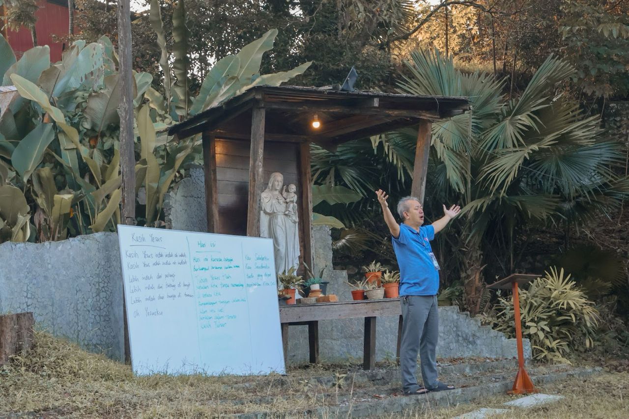 Figure 5. Fr. Ramon leading the morning prayer and exercise at the grotto of St. Lukas Centre.